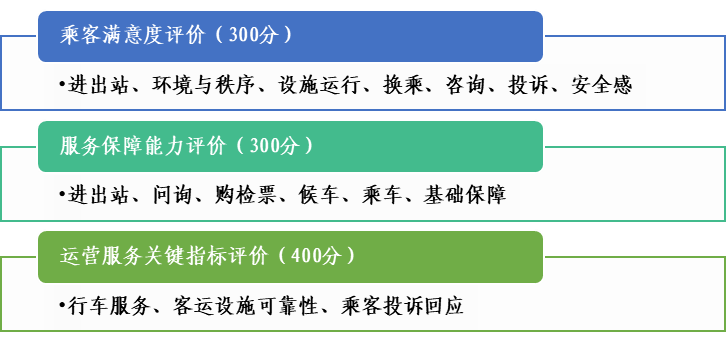 评价内容包含乘客满意度评价、服务保障能力评价及运营服务关键指标评价3个部分,基准分值1000分。
